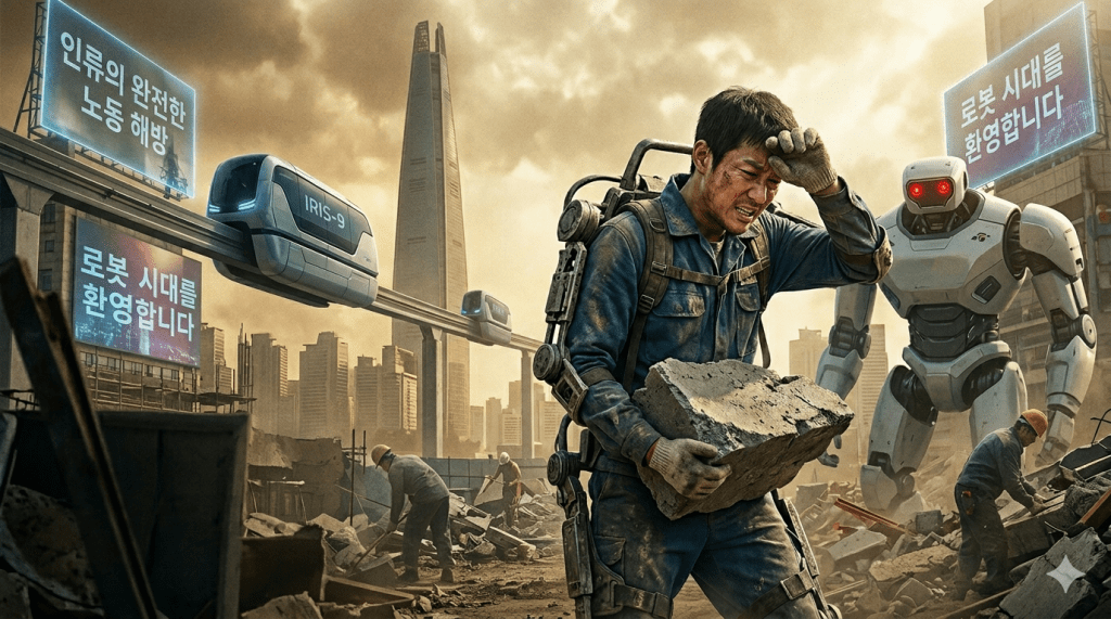 ​강남의 하늘을 가로지르는 자기부상 레일 위로는 최신형 ‘아이리스-9’ 행정 로봇들이 매끄럽게 미끄러지며 도시를 관리했다. 그들은 지치지 않았고, 실수하지 않았으며, 무엇보다 ‘존엄’을 요구하지 않았다.